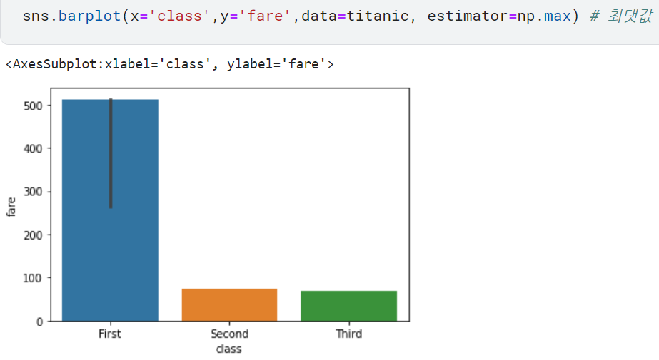 한편 barplot()으로는 평균이 아닌 중앙값, 최댓값, 최솟값을 구할 수도 있습니다.