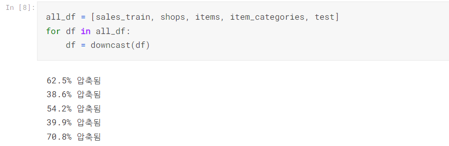 이 함수를 이용해 shops, item_categories, items, sales_train, test에 데이터 다운캐스팅을 하겠습니다.
