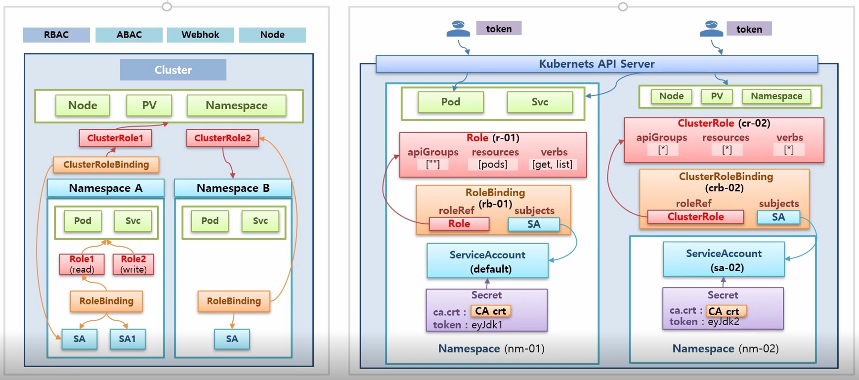 또한 네임스페이스를 만들면 자동적으로 ServiceAccount 가 만들어지기도 하고 추가적으로 더 만들수도 있는데, ServiceAccount 에 Role과 RoleBinding 을 어떻게 설정을 하냐에 따라 해당 ServiceAccount 는 네임스페이스 내의 있는 자원에만 접근을 할수도 있고 아니면 클러스터에 있는 자원에도 접근을 할 수가 있게 됩니다.
