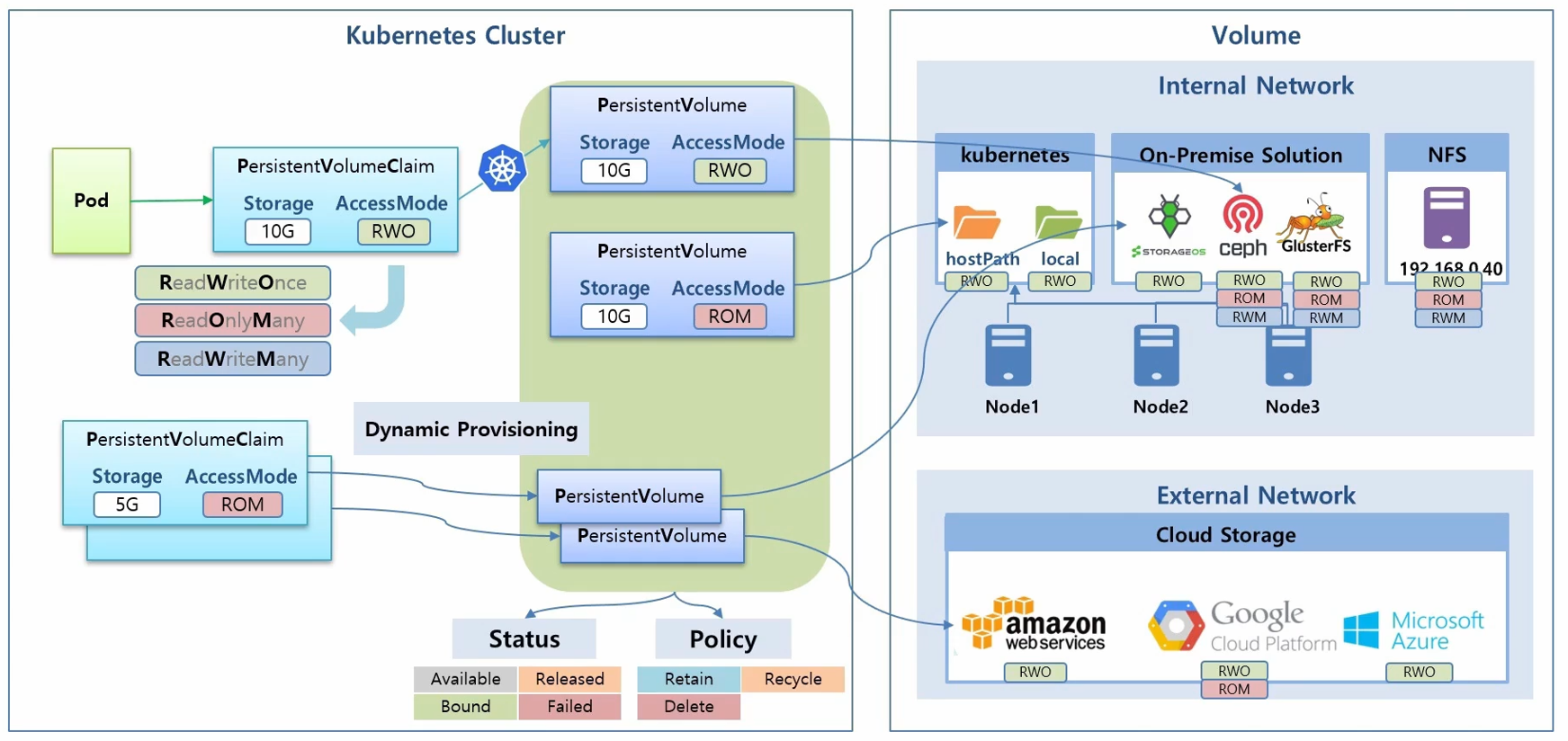 - Delete : PVC를 지우면 PV도 같이 지워집니다. 해당 정책을 StorageClass를 사용해서 자동으로 PV를 만들었을 때의 기본 정책입니다. 볼륨의 종류에 따라 실제 데이터가 삭제되기도 그렇지 않기도 합니다.